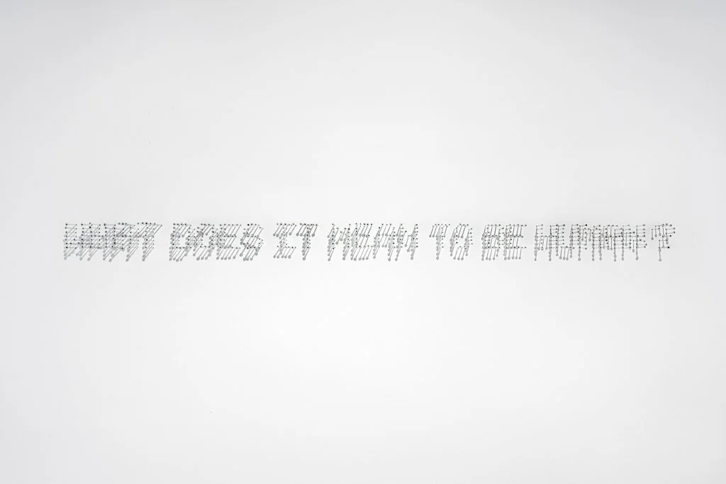 The artwork is conceived as a linguistic dispositif created entirely in Murano glass. Individual glass nails are arranged side by side to form a visual question suspended in space.